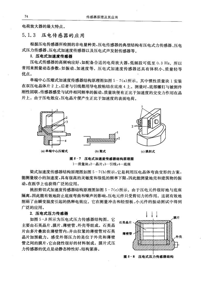 | 文摘: 5.1.3壓電傳感器的應用 根據壓電傳感器所檢測的非電量種類,壓電傳感器的典型結構有壓 1.壓電式加速度傳感器 壓電式傳感器的高頻響應好,如配備合適的電荷放大器,低頻段可低至 單端中心壓縮式加速度傳感器結構原理圖如圖5 - 7(a)所示。艿中慣性 |