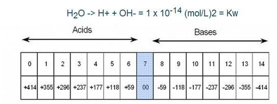 pH是酸度或堿度的測量。氫離子量(H+) 決定一種液體是酸性的(高濃度氫離子)還是堿性的(低濃度氫離子)。pH值的范圍為0~14。低于0或大于14的值可能是有的但很少,且不能用我們的電極來測量。pH標度是從水解常數派生出來的,其方程如下: