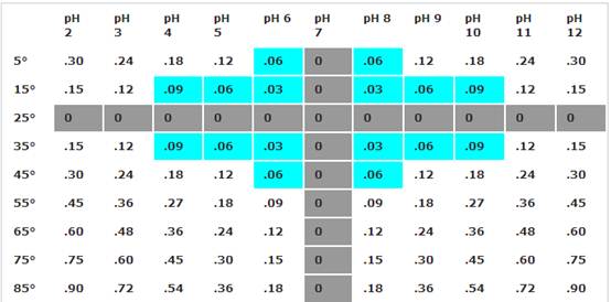 注意: 淺藍色數值的誤差小于0.1 ,可能不需要溫度補償。灰色數值是溫度和pH值,沒有溫度導致的pH值誤差。