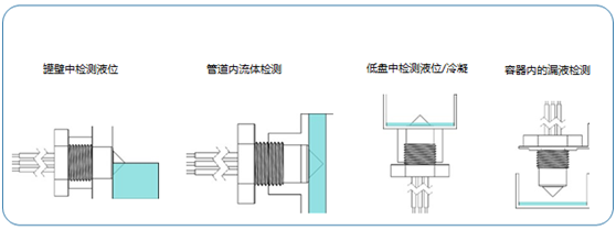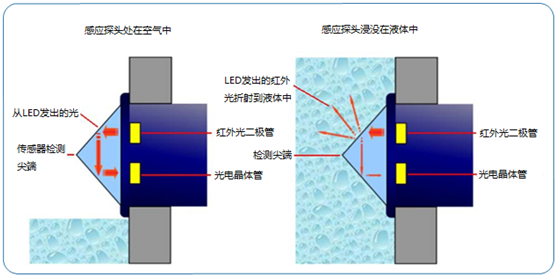 當(dāng)液位開(kāi)關(guān)的感應(yīng)探頭裸露在空氣中,紅外光會(huì)在探頭尖端內(nèi)反射回光電晶體管,從而在紅外光二極管與光電晶體管之間形成強(qiáng)力的光耦合。當(dāng)感應(yīng)探頭浸沒(méi)在液體中,紅外光會(huì)從探頭尖端內(nèi)折射出去,造成在光電晶體管這端接受到的光量有所減少,因此觸發(fā)輸出狀態(tài)的改變。
