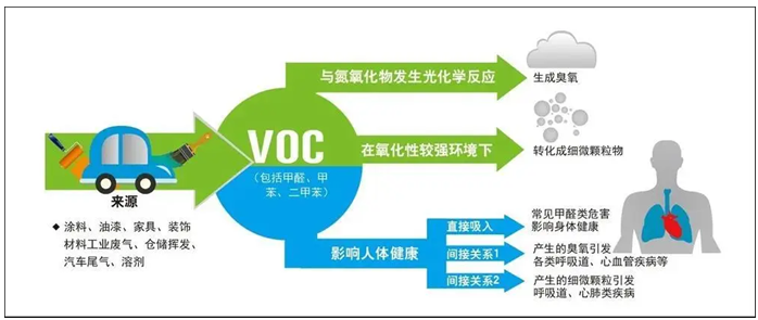 了解了VOC的定義,這VOC總不可能平白無故的產生吧,VOC室外主要來自燃料燃燒和交通運輸;室內主要來自燃煤和天然氣等燃燒產物、吸煙、采暖和烹調等得煙霧,建筑和裝飾材料、家具、家用電器、清潔劑和人體本身的排放等,簡單來說我們日常生活中VOC無處不在,為什么VOC可以這么滲透在我們日常生活中呢?VOC的主要成分有:烴類、鹵代烴、氧烴和氮烴,它包括:苯系物、有機氯化物、氟利昂系列、有機酮、胺、醇、醚、酯、酸和石油烴化合物等。這些成分說明VOC更多可能存在于化工、石油等等工業廠區,VOC這么普遍的存在,是否意味著我們生命時刻遭受著威脅呢?