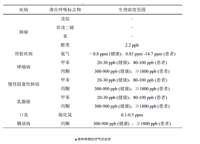 身體或血流的某些代謝物及化學物質在通過肺循環進入肺泡時可以釋放出來,通過呼吸交換排出體外,因此,呼出氣體組分濃度可反映血液中某種成分的水平,人體呼出氣體中的揮發性化學物質測量是一種對身體無損害的檢測技術。