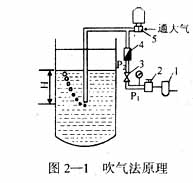 吹氣法:該方法的工作原理如圖2—1所示[4]。圖中,1-過濾器;2-減壓閥;3-節流元件;4-轉子流量計;5-變送器。因吹氣管內壓力近似等于液柱的靜壓力,故 P=ρgH