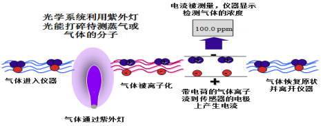 PID使用了一個紫外燈(UV)光源將有機物分子電離成可被檢測器檢測到的正負離子(離子化)。檢測器捕捉到被離子化的氣體的正負電荷并將其轉化為電流信號實現氣體濃度的測量。